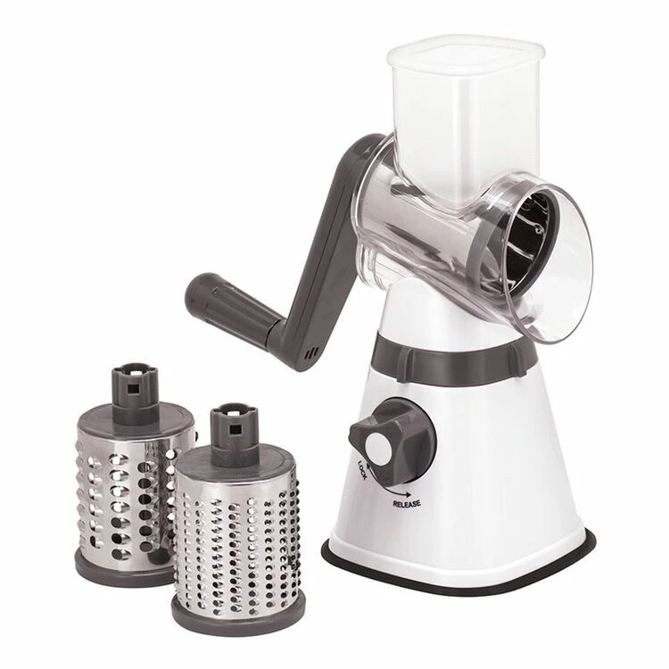 | Features | 3 interchangeable stainless steel drum bladesEasy to use hand crank mechanismAngled dispenser reduces cloggingPowerful suction base adheres to smooth, non-porous work surfacesAll pieces are detachable for cleaning |