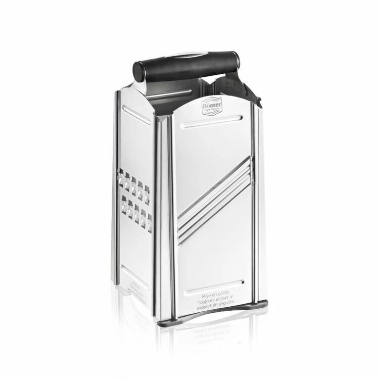The Borner Combi Chef Box Grater is the Original Four-In-One grating device from Borner. Ideal for slicing, grating and the preparation of coarse foods and Swiss Rosti. The integrated bowl catches the cut materials without leaving any spills. This is a must for every kitchen. Create fast and healthy meals made from fresh fruit and vegetables. The sharp polished two way blades cut accurate slices, fine “Julienne strips”, and the coarse grater is ideal for hash browns and Swiss Rosti. The integrated bowl catches the cut materials without leaving any spills. Simply clean the Combi Chef under running water and your kitchen will be spotless. The Combi Chef is Not only a practical helper but also a great decorative piece for your kitchen.