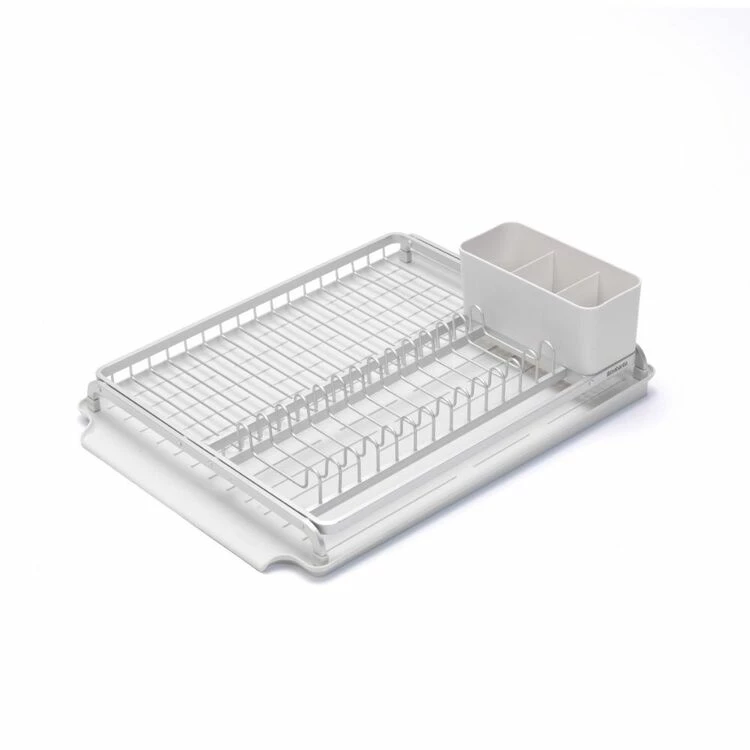 Dry your dishes with style with the Brabantia Dish Drying Rack Light Grey. This beautiful and smart dish drying rack offers ample space for your dishes, bowls, glassware, cutlery etc. Water from dripping dishes runs directly into the sink your worktop stays dry. Features a removable cutlery basket easy to take your cutlery to the drawer, is made of corrosion resistant materials, and the drip-tray prevents your worktop from getting wet and can be used separately as well.