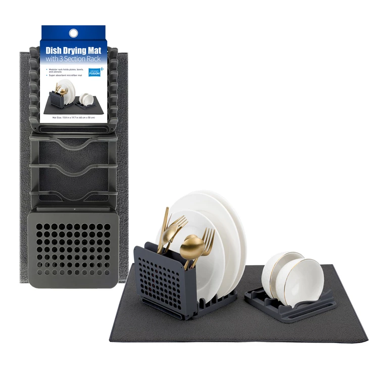 This Madesmart Dish Drying Mat with 3-Section Rack is a value set that includes a dish rack and drying mat to conveniently air out your tableware and cutlery without making a mess in your kitchen counter. The rack features 3 modular sections: a bowl holder, plate holder and utensil organiser for quick drying, while the mat is crafted from microfibre fabrication for extra absorption.