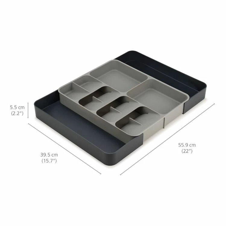 The Joseph Joseph Drawerstore Grey Cutlery Utensil And Gadget Organiser will help clean up your messy utensil and cutlery drawers with this practical and smart storage solution. This unique tray combines five overlapping compartments for storing cutlery with three deep-sided compartments for holding utensils and gadgets. What is usually stored in two drawers can now be neatly organised into one, creating more space in your kitchen.