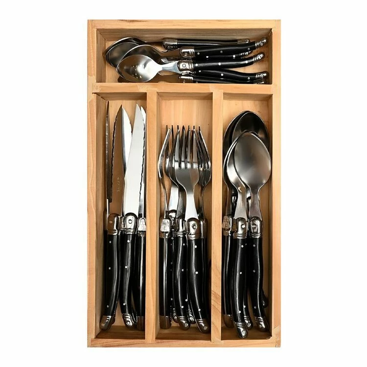 Sporting a sleek black colour and elegant shapes, the Laguiole Elite Pearl Black 24 Piece Cutlery Set provides premium and stylish cutlery for your kitchen. Made from quality stainless steel materials and a sturdy wooden handle, for durability and sharpness that’ll last for years to come. Shop the full Laguiole Elite range, available online and in-store at Harris Scarfe.