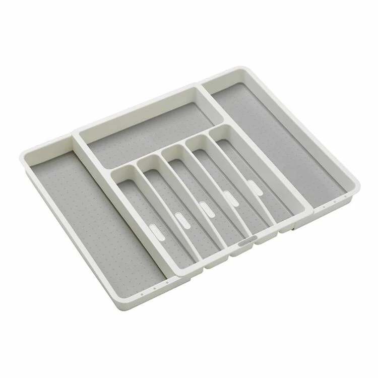 The Madesmart Expandable Cutlery Tray White is a traditional 6 compartment tray expanding to 8, fitting most kitchen drawers to help with cutlery and utensil organisation. The rounded corners and soft-grip lining make this cutlery tray highly functional, easy-to-clean, and aesthetically pleasing. The tray is made from high-quality, BPA-free plastic for long-lasting organisation.