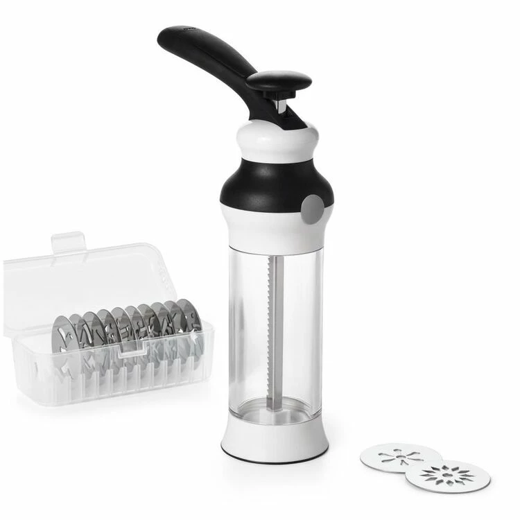 Creating an impressive, consistent cookies is a cinch with the OXO Good Grips 14-Piece Cookie Press Set. The non-slip base keeps the Press steady so you get uniform cookies with a simple pump of the large, comfortable lever. The clear body is easy to fill and shows you how much dough you have left. The press disassembles quickly for thorough cleaning. The set includes a convenient storage case for 12 durable stainless steel disks: Daisy, Flower, Sunflower, Fleur-de-lis, Butterfly, Bear, Shell, Leaf, Heart, Snowflake, Tree and Wreath.