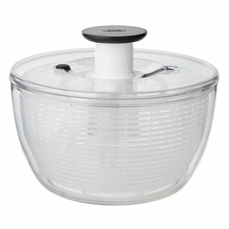 The OXO Good Grips Salad Spinner is the quick and easy way to dry greens or herbs. For clean, dry ingredients, just press the soft, non-slip knob. The spinning basket doubles as a colander, so you can rinse lettuce and more with ease. The non-slip base prevents skidding, and the patented built-in brake button stops the spinner on a dime for unloading. Toss and serve your salad right in the bowl: The durable dish is crystal clear and moves seamlessly to the table. Simply slide the lock to hold the pump flush with the lid for compact storage. The lid comes apart for thorough cleaning.