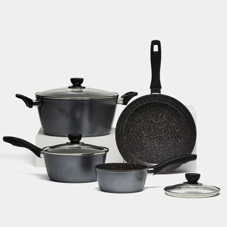 The Smith & Nobel Pro Stone 4 Piece Cookset is what you will use often to make a lovely meal for family and friends. Each of these pieces is constructed with a heavy gauge forged aluminium body, interior ceramic marble coating, stylish soft touch heat resistant handle and PFOA free. The casserole and saucepan come with tempered glass lids with a steam vent. This set is suitable for all stove tops including induction.